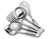 Stainless Steel 5 pc kitchen tool set includes, ladle slotted spatula, spoon, slotted spoon and whisk. Dishwasher safe, oven proof to 450ºF, durable with loop handles for easy hanging storage. Strong & Durable Premium quality Stainless Steel Heavy guage Stainless Steel Dishwasher safe Can be used on all cooking surfaces