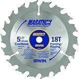 The IRWIN Marathon 5 1/2in. 18-tooth circular saw blade is designed tough and long lasting for the professional. The thin kerf design provides faster, cleaner cutting action as less material is being removed. The hardened plate runs truer and avoids warping. C3 carbide tips provide long life and are impact resistant. The specifically engineered heat vents reduce heat and resin build up which can lead to blade binding and warping. Marathons unique shoulder design puts more support behind each tooth and provides for consistent chip removal. Marathon saw blades are truly Long Distance Runners. Blade Use: Framing and Ripping, Blade Diameter (in.): 5 1/2, Arbor Size (in.): 3/8, TPI (Teeth per Inch): 18, Tooth Grind: Face Ground Carbide, Tip Type: C3 Carbide, Reinforced Shoulder: Yes, Engineered Venting: Yes, Professional Series: Yes, Blade Speed (RPM): 8,500, Blades (qty.): 1 Ultra-thin kerf for more cuts per charge Construction carbide teeth for longer life Face ground carbide teeth for fast, clean cuts Fully hardened plate runs truer longer Reinforced shoulder for added durability