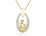 This beautiful mother and baby pendant will make any mom feel special. A gift to be treasured! 2 round diamond weighs 0.015ctw, color I-J, clarity I1-I2 and is set to perfection in smooth 14K yellow gold. Pendant measures approximately 18x10mm and hangs from an 18 inch rope chain also in 14k yellow gold.