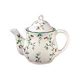 Hand painted sculpted Winterberry 4 cup teapot will add a warm atmosphere to your holiday kitchen. Perfect for everyday use Great for casual entertaining Has a full collection of entertaining and serving pieces to complete your dining experience Create your ideal table setting with assorted coordinating salad plates and matching mugs 4-cup sculpted teapot measures 9 by 8-3/4 by 8-3/4 inches 5-year warranty against defects; made in the USA Crafted from durable stoneware with a textured glaze Safe to use in the dishwasher, microwave, and freezer White with decorative sprigs of holly and a thin green stripe along the rim