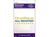 SEI Iron Ons are durable, easy to apply, perfect to decorate clothing, bags and totes, pillows, paper and so much more. Place right side up in desired location. The colors won't fade and the design won't crack or peel. Test to be sure temperature and timing are appropriate for your fabric. Turn garment inside out to machine wash-cold and air dry. Art All-Nighter- A captions of "I'm pulling an" in Yellow and "All-Nighter!" in Navy, with a row of Yellow stars below the caption. It is approximately 4.25"x 1.75".