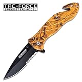 This fast action Tac-Force spring assisted knife gives you a tactical advantage when every second counts. Product Specifications: Solid steel orange camo handle. Window breaker on end of handle. Sharpened 440 stainless steel half serrated. In-line open lock. Includes pocket / boot clip. Seat belt and cord cutter. 4.75" closed, 3.5" blade. Sharpened 440 Stainless Steel 3.5" Half Serrated In-Line Open Lock Solid Steel Orange Camo Handle Window Breaker & Seat Belt Cutter on Handle 4.75" Closed, Overall Length 8"